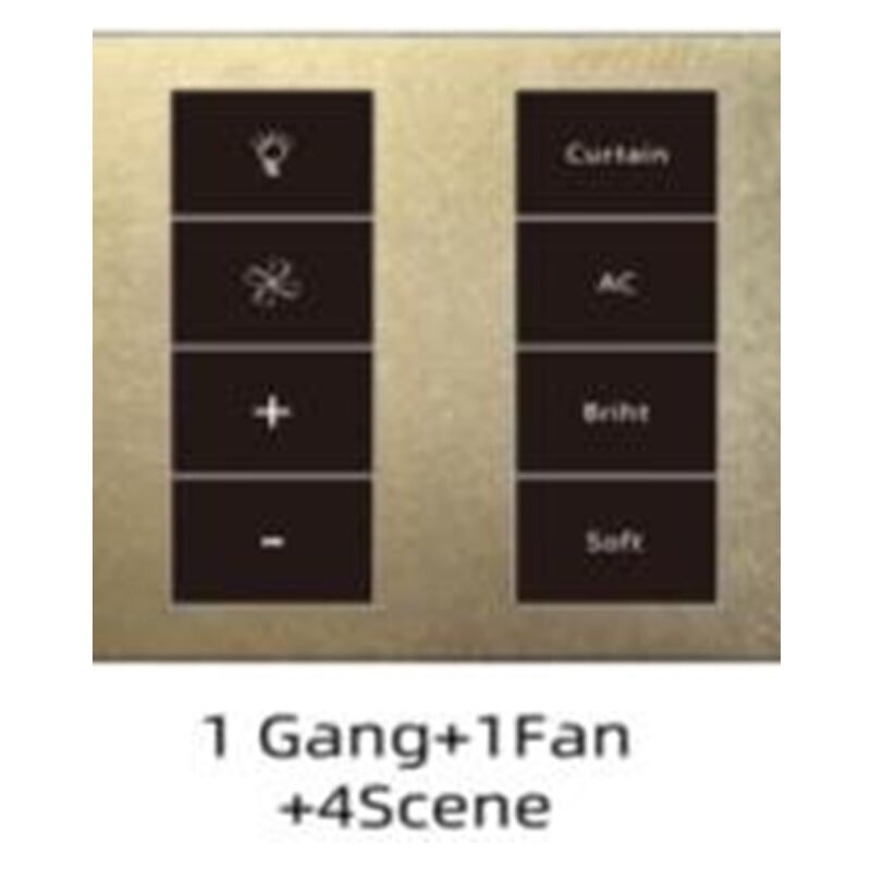 1Fan(speed)+1Gang+4Scene Smart Switch | ● 110~250V/50/60Hz ● LED/300W (can customized 1000W) ● Resistance Load/600W ● Key panel material: Aluminum Color: White, Grey, Black, Golden |